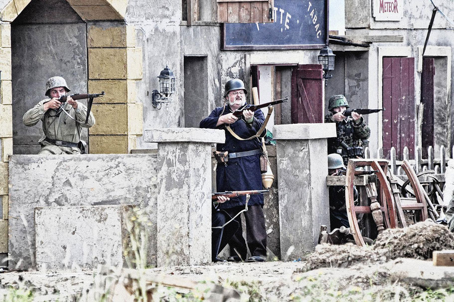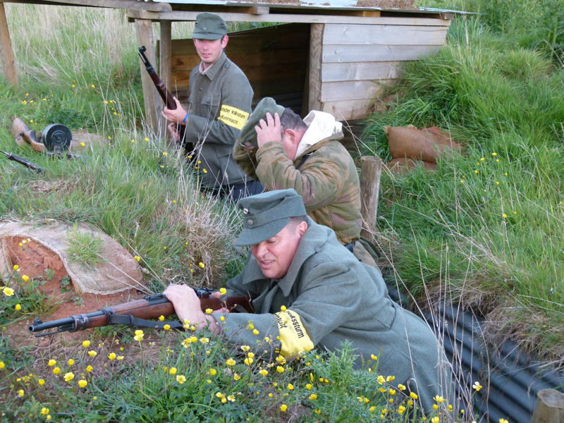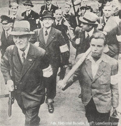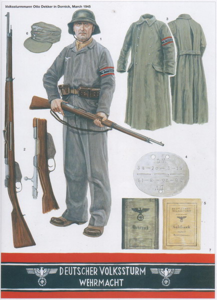 La Volkssturm est l’équivalent du «Home Guards» britannique. Créer en octobre 1944 elle était destiné à être une force pour une héroïque et ultime défense de l'Allemagne. La réalité est un mélange d'unités désespérées et souvent réticentes, vêtus et armés avec à peu près n'importe quoi restant dans les entrepôts.
