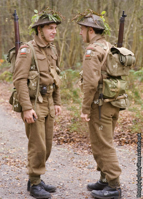 • UK P-37 Battledress (u1, u2); Jackets + Trousers. Le Battledress canadien ou britannique standard est fait en laine. Le «Battledress Denim» basé sur la coupe «economy issue» (les boutons sont visibles) sera aussi accepté. Voir l'image plus bas pour les couleurs.
