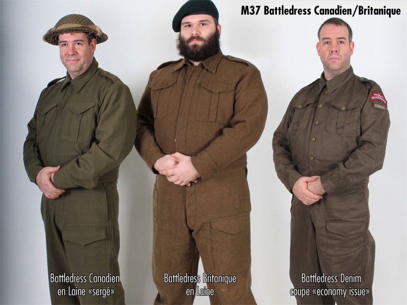 • UK P-37 Battledress (u1, u2); Jackets + Trousers. Le Battledress canadien ou britannique standard est fait en laine. Le «Battledress Denim» basé sur la coupe «economy issue» (les boutons sont visibles) sera aussi accepté. Voir l'image plus bas pour les couleurs.